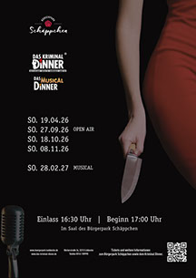 Jetzt wird es mörderisch - Sein Sie dabei wenn das Kriminal Dinner im Schäppchen gastiert. Das Krimitheater wird durch unser großartiges 3-Gänge Menü in mehrere Akte unterteilt. Genießen Sie beste Unterhaltung und kulinarische Köstlichkeiten in unserem fantastischen Ambiente des Bürgerpark Schäppchen zu folgenden Terminen (immer Sonntags):